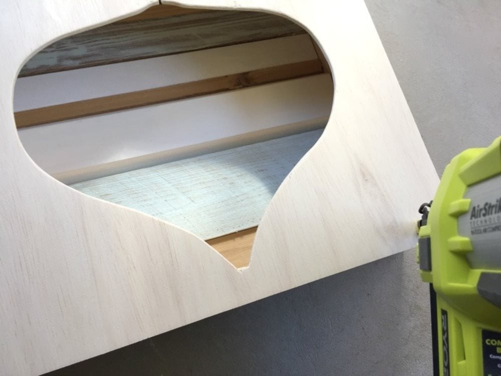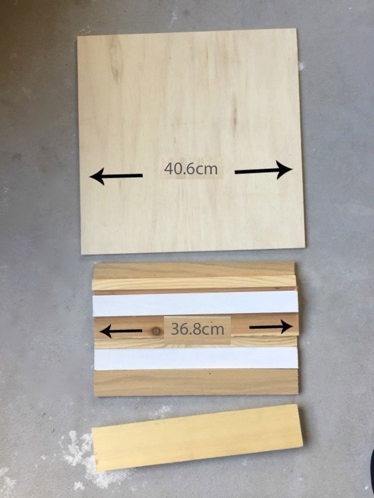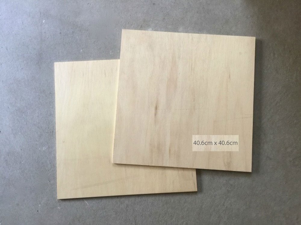 Először vágj ki két 6,4 mm-es rétegelt lemezből 41 cm x 41 cm méretű négyzetet. Ezek lesznek a doboz eleje és hátulja.