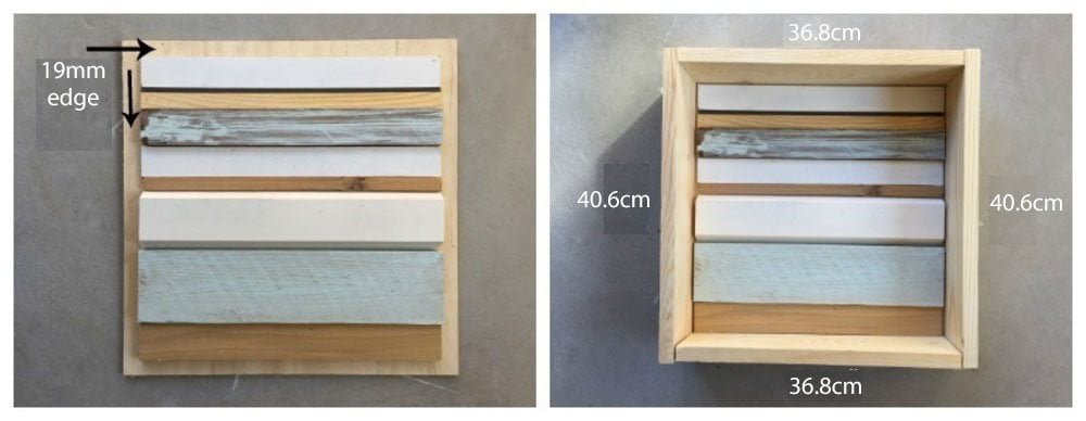 Vágjon 37 cm hosszúságú léceket. Ragaszd őket a rétegelt lemez másik négyzetére, hogy kialakítsd a darab hátsó falát.
