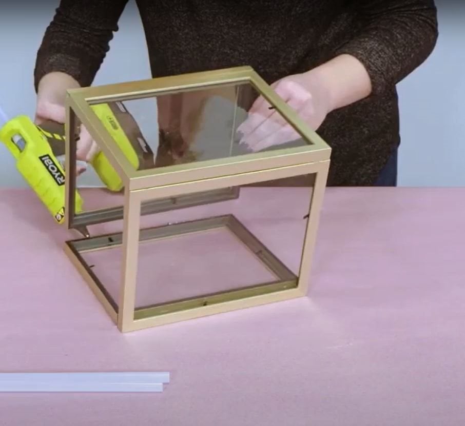 Vidd fel ragasztót a keret egyik sarkának külső oldalára, és nyod össze, hogy kialakítsd a dobozt. Ha teljesen megszáradt, díszítsd ízlés szerint!