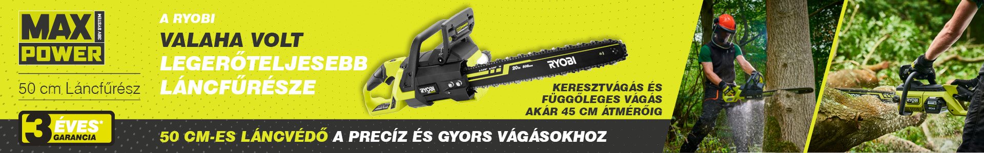 A RYOBI® MAX POWER vezeték nélküli 50 cm-es szénkefe nélküli láncfűrésszel nagyobb fákat és nagyobb rönköket vághat ki, mint valaha a MAX POWER termékcsaládunkban. A hozzáadott 2,07:1-es áttétel további nyomatékot biztosít a lánc sebességének megőrzéséhez még a legnehezebb alkalmazásokban is. Ez a láncfűrész a MAX POWER termékcsaládunk része, amely a szükséges erőt és teljesítményt biztosítja a benzines láncfűrész hátrányai nélkül. Nagy nyomatékú szénkefe nélküli motorral rendelkezik, amely 18,5 m/s láncsebességet biztosít a tökéletes vágási élmény érdekében. A szénkefe nélküli motor súrlódásmentes, így hosszabb az élettartama és hatékonyabban működik. Ergonomikus fogantyúval, automatikus kenéssel, valamint gyors és megbízható láncfékkel rendelkezik a kényelem és a biztonság érdekében. A kerti akkus szerszámok MAX POWER rendszerének részeként ez a szerszám bármely MAX POWER akkumulátorral működtethető!