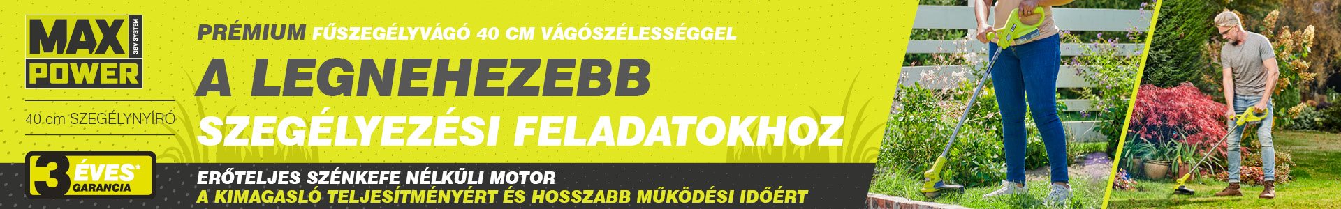 A MAX POWER 40 cm-es szénkefe nélküli szegélynyíró tökéletes választás a legkeményebb fű és gyomok leküzdésére nagyobb területeken és nehéz körülmények között.