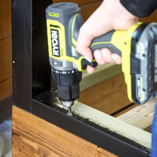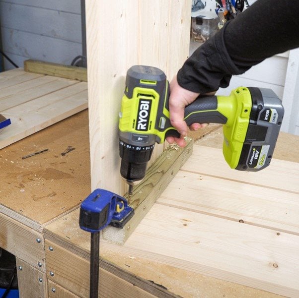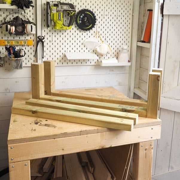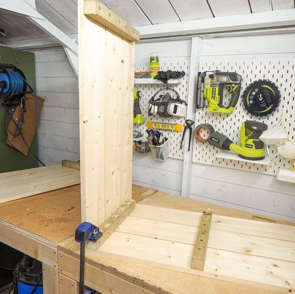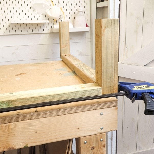 Vegyünk még két 38 mm x 63 mm @ 680 mm darabot, helyezzük őket derékszögben a lábakhoz, és szorítsuk össze őket. Rögzítsd sarokkonzolokkal, és ismételd meg a másik oldalon.