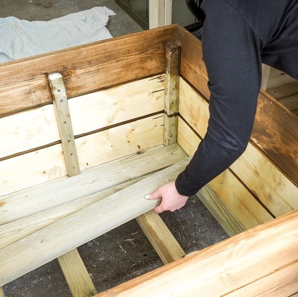 Helyezd rá az alapot, és rögzítsd a helyére. Fordítsd meg a virágtartót úgy, hogy az a lábain álljon. Helyezd mind a hat 22 mm x 100 mm-es 760 mm-es darabot alulra, hagyj helyet mindegyik között. Ez lehetővé teszi a mozgást a fában, de fontos szerepet tölt be vízelvezetésként is, amit később bemutatunk.