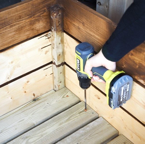 Csavard be a facsavarokat minden vezetőfuratba. Ez az egyike a virágtartó láda két rövid oldalsó paneljének. Ismételd meg ezt a folyamatot a maradék három 18 mm x 144 mm-es 764 mm-es darabbal, hogy elkészítsd a másik rövid oldallapot.